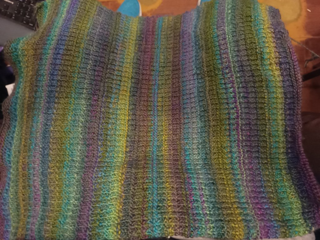 This meant that today I worked more on the Safe Haven shawl, which is growing very slowly indeed! I had hoped to have this finished by this coming weekend but no way is THAT going to happen as I still have at least twice as much again to knit (ie I am approximately a third of the way through it *sigh*), I will say the colour and warmth are going to be worth it in the long run mind you. Now I need to decide if I am taking this with me when we go away for a fortnight, or do I take the Granny Square tote bag kit, some small cross stitch kits or even all three!