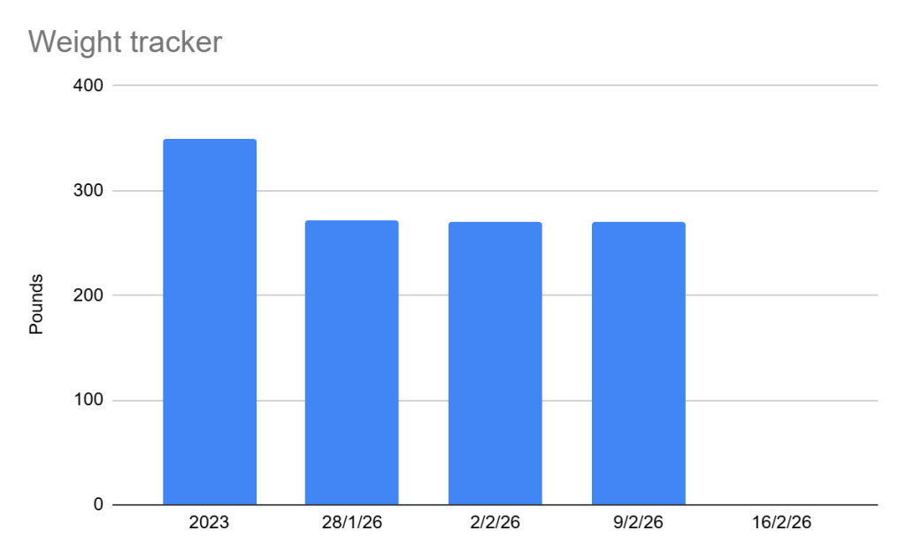 Not such a great week last week, no weight loss, however, I did lose an inch from my waist! I am a little fed up of the scales not shifting (another 7 lbs and I will have lost half of what I want to lose). I think part of the problem is my red wine consumption has increased and whilst I am not busted on the calorie front, the “empty” calories are not helping. I must confess I don’t want to give up the booze totally but I do think I need to rein it in a little.
