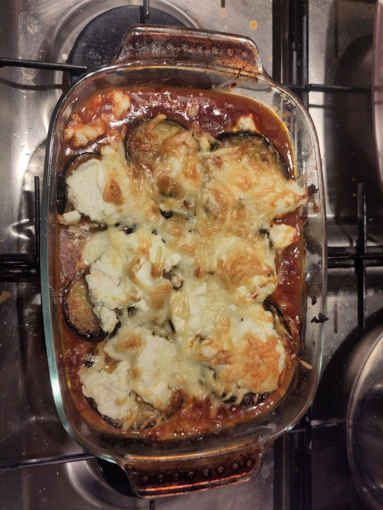 - 2 large aubergines, sliced into thin slices about a 5mm/¼in thick