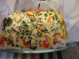 - Pour the eggs into the oven tray making sure they spread into the corners. Scatter the peppers, mushrooms and spinach over the eggs and top with the cheddar.